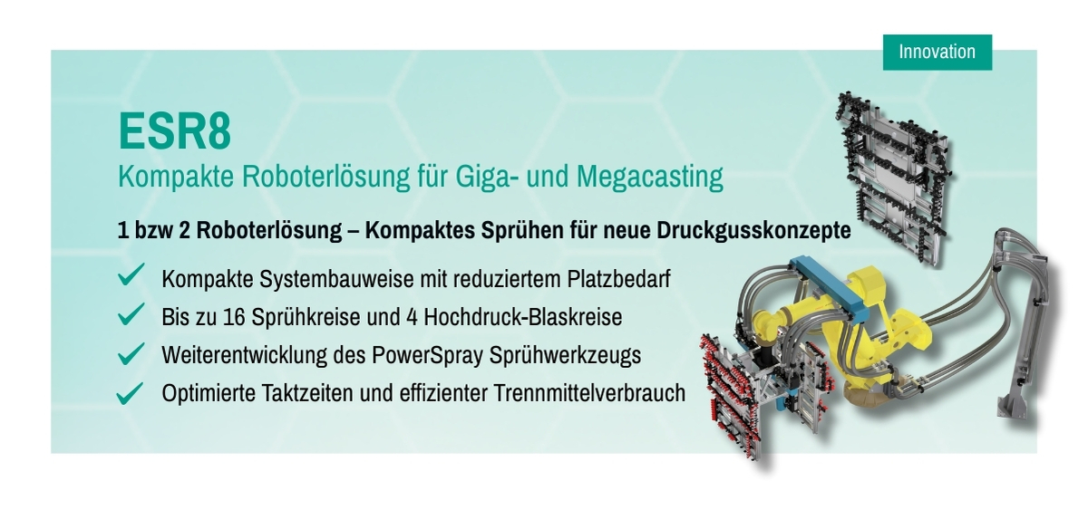 Das ESR8-Konzept ist eine kompakte Ein-Roboter-Sprühlösung für flexible Druckgusszellen.